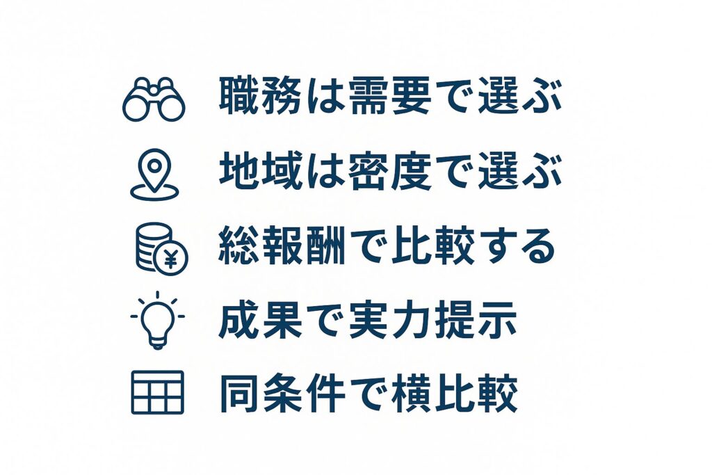 次に地域選択では、首都圏・中京圏・関西圏・主要地方中核都市の間で、案件密度と通勤負荷、転勤可能性のバランスを取ります。案件密度が高い地域は、同種職務の求人比較が容易で、待遇・裁量・働き方の選択肢が増える傾向があります。