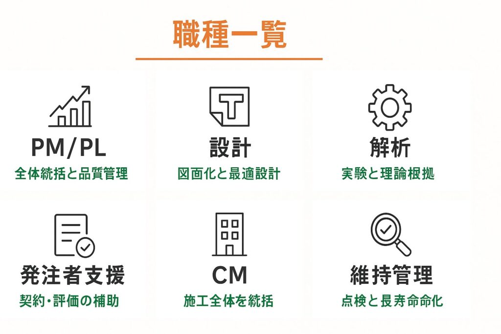 発注者側の立場でコスト・スケジュール・品質を一体管理。施工段階の全体管理に強い職種。 - 維持管理(点検・診断・補修設計)