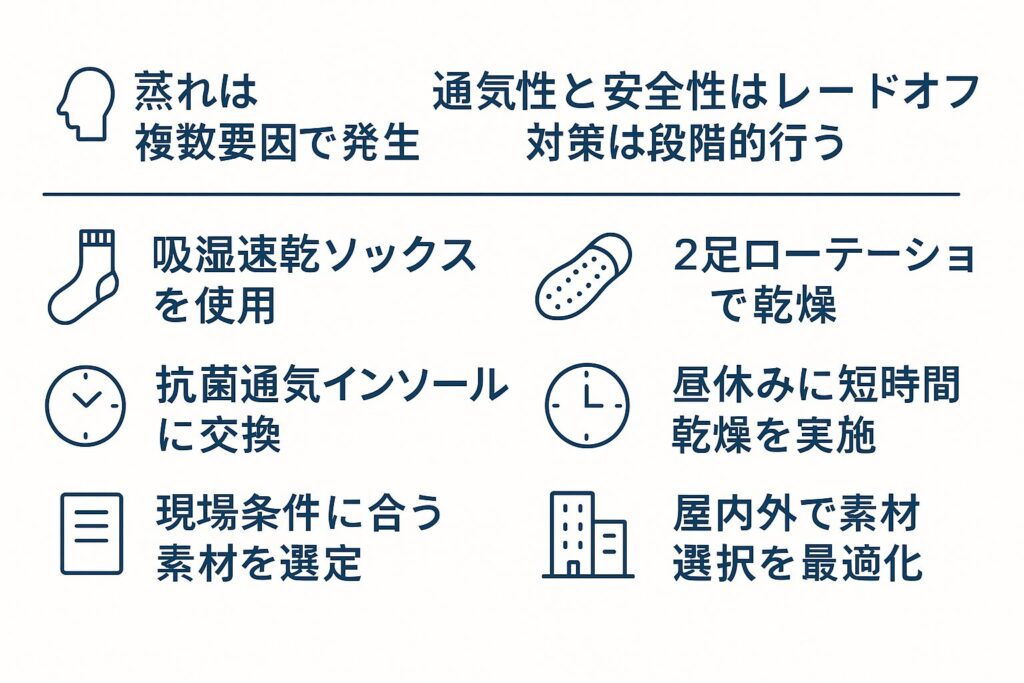 • 蒸れ対策にはソックス・インソール・ローテーション運用を組み合わせるのが効果的。