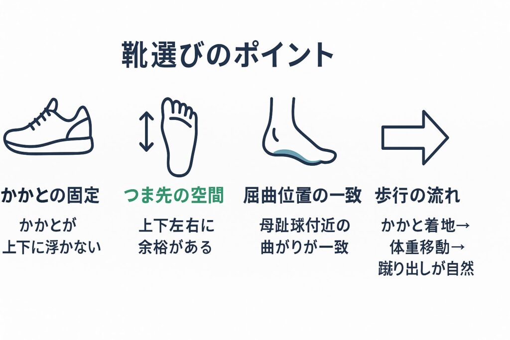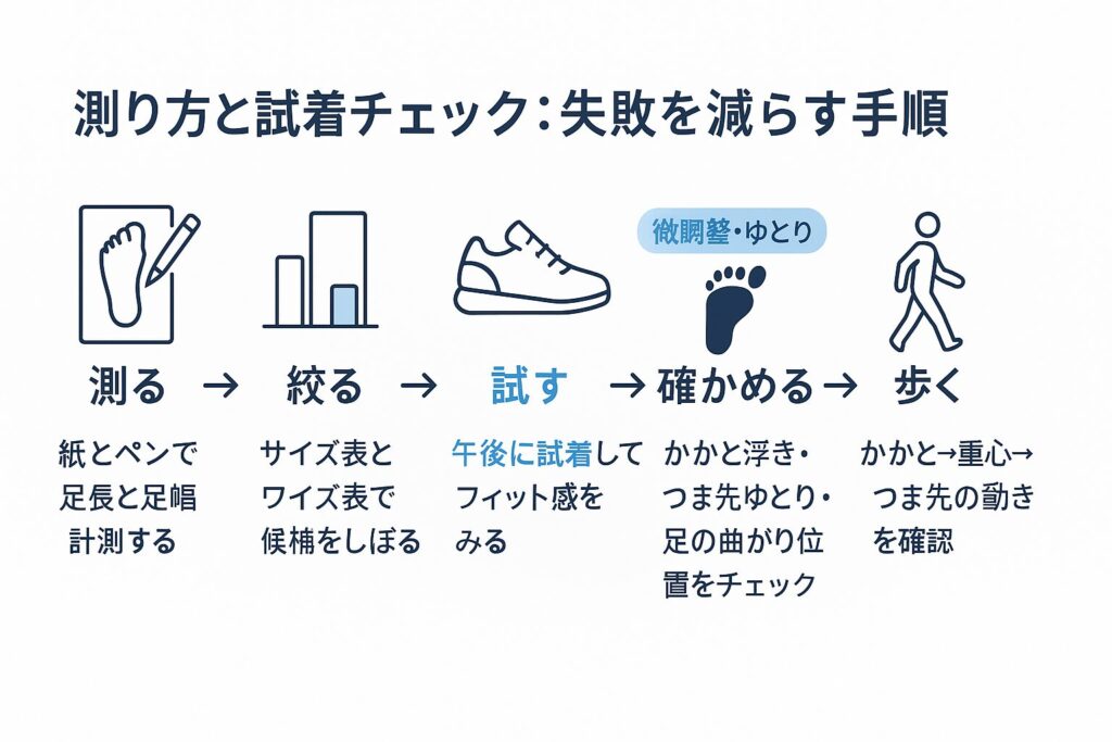 はじめに、紙とペンで足長と足幅(母趾球と小趾球の最も広い位置)を計測し、メーカーのサイズ表とワイズ表記で候補を絞ります。店頭・自宅試着では、午後(むくみが出やすい時間帯)に以下を確認すると、疲れにくさの見極め精度が上がります。