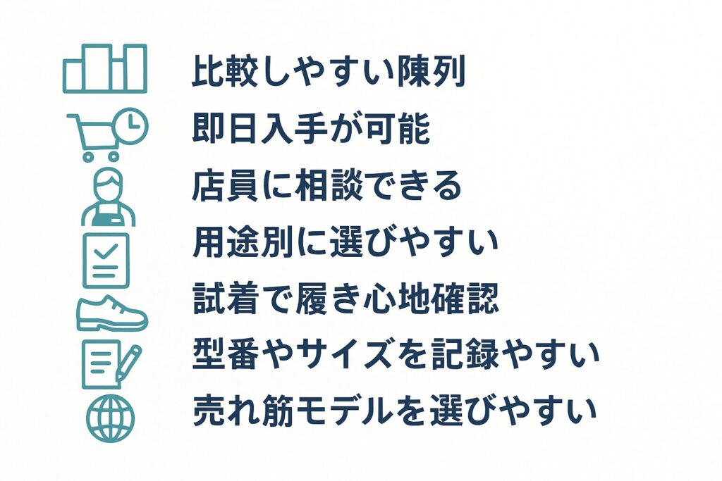 | サイズ・フィット | 実試着で当たりと屈曲点を確認できる | 足囲・半サイズの在庫が限られる場合あり |