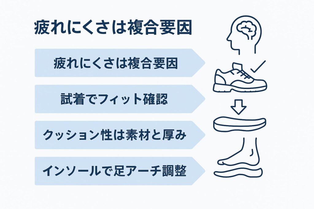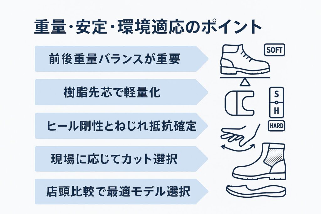 つま先の先芯(保護カップ)の位置と高さ、甲周りの容積、踵のホールド、足裏の屈曲点の位置が合致して初めて、つまづきや足裏疲労のリスクが抑えられるため、店頭での試着が合理的です。