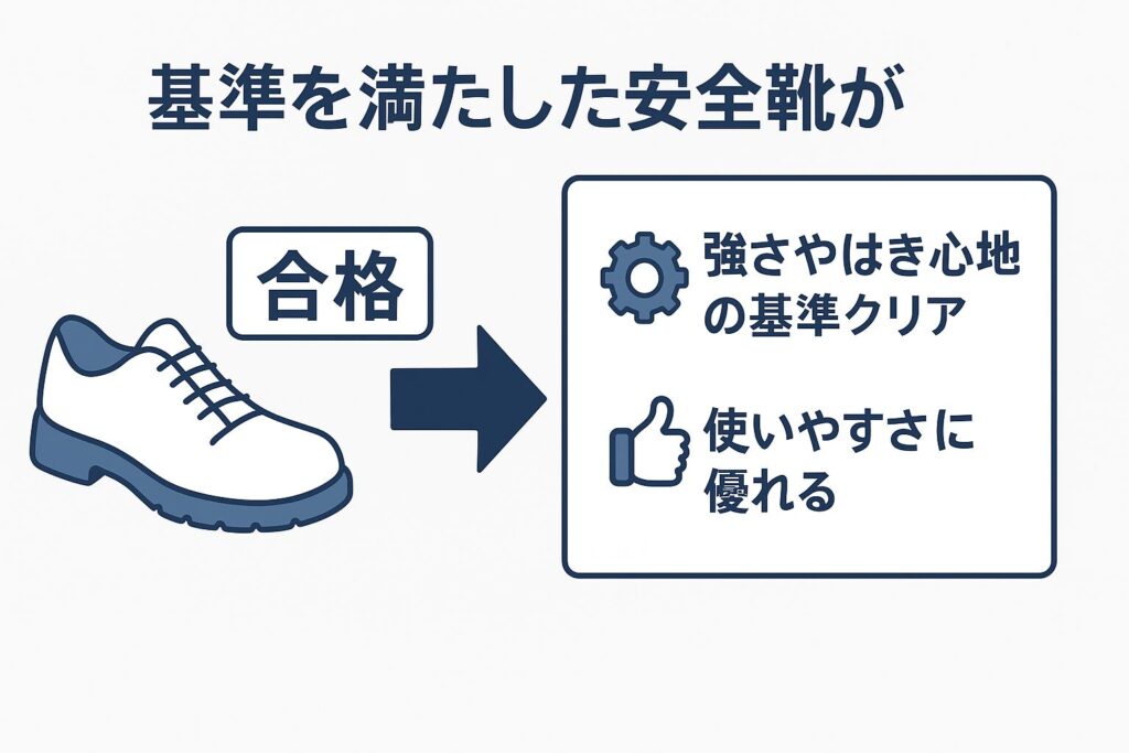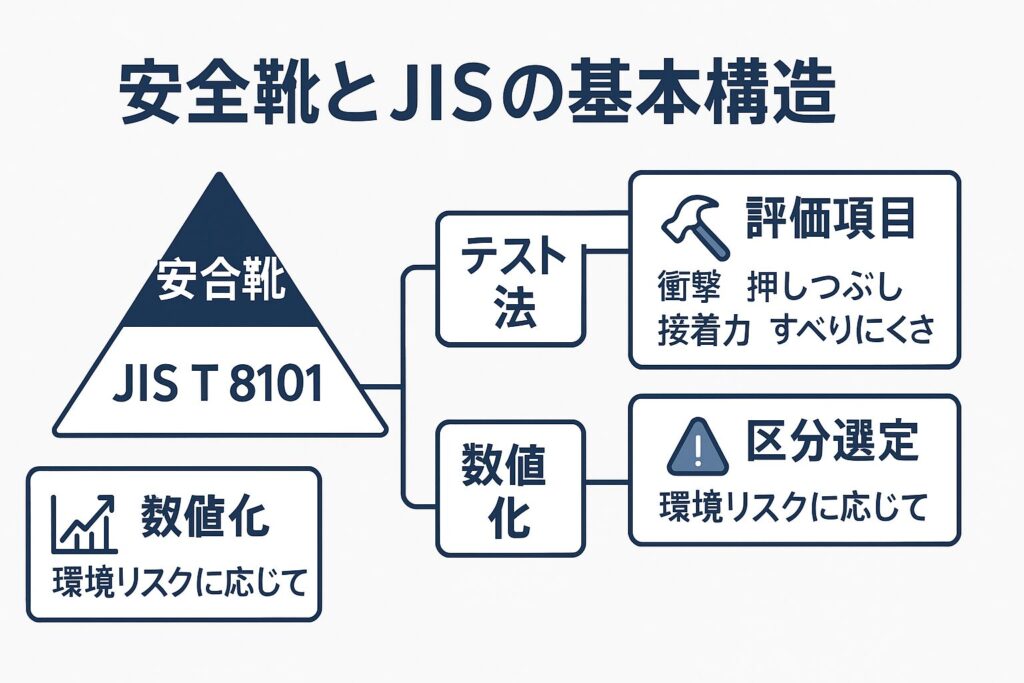 JISは製品の要求事項と試験方法を体系化した国家規格で、つま先部の耐衝撃性や耐圧迫性、はく離抵抗、表底の耐滑性などの評価項目を規定し、用途区分に応じた基準値を設けていると案内されています。