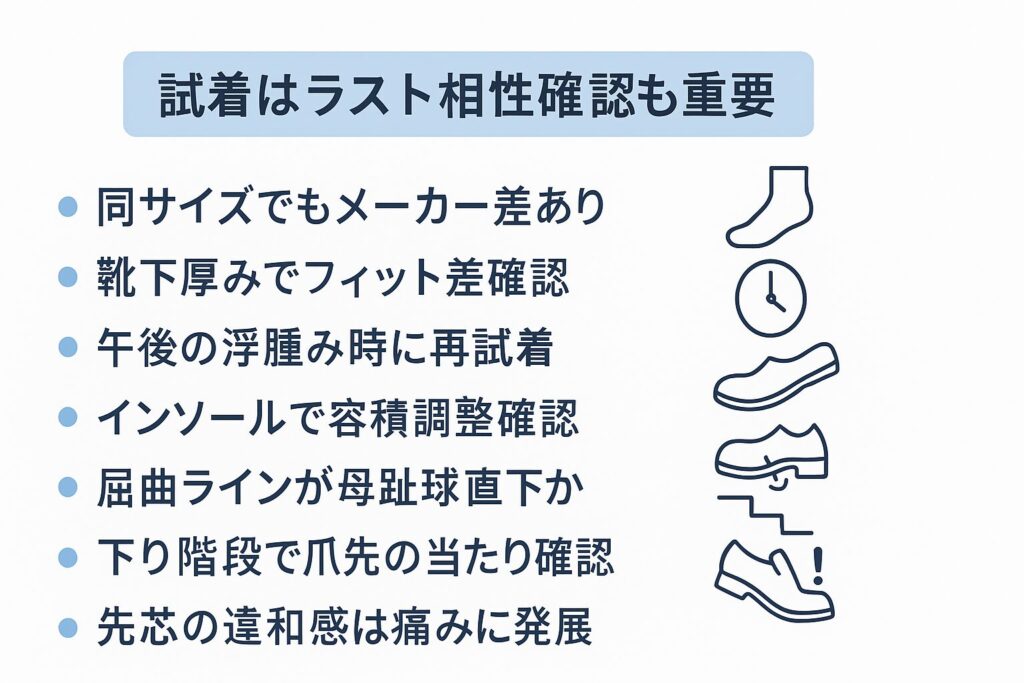 試着は「サイズ選定」だけでなく、ラスト形状の相性検証という意味で重要です。数値として同じ26.0cmでも、メーカーやモデルごとに足長・足囲・甲の立ち上がりや踵の掴みが大きく異なります。